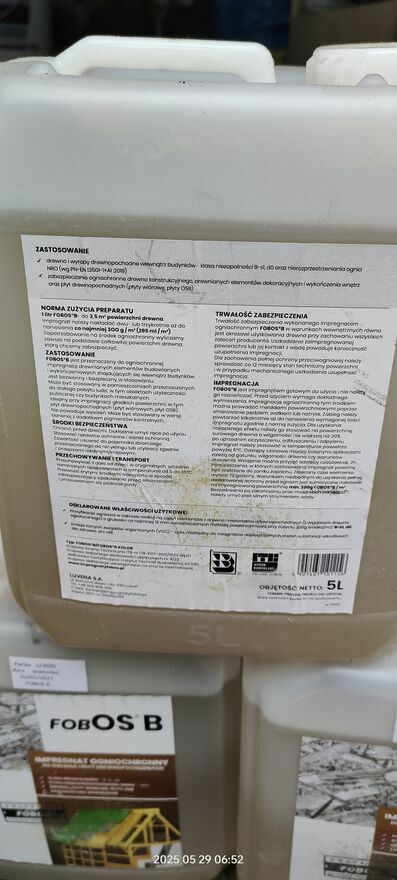 FOBOS B to wodny impregnat ogniochronny przeznaczony do stosowania wewnątrz budynków. Nowoczesna receptura o podwyższonej lepkości ułatwia stosowanie na gładkich powierzchniach wyrobów drewnopochodnych.